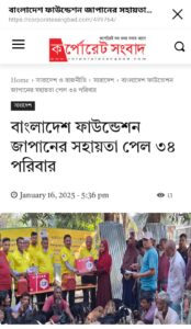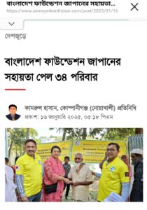 2024年8月にバングラデシュで洪水になった、以上のパンフレット作成し寄付金/支援金を当財団の会員と日本在住バングラデシュ人に呼びかけました。 ১৬ ই জানুয়ারি বাংলাদেশ ফাউন্ডেশন জাপান, গতবছর এর নোয়াখালী বন্যায় ক্ষতিগ্রস্তদের ছাগল ২০টি, সেলাইমেশিন ২টি, গরু ২টি, ডেউটিন ৯ বান, ভ্যানগাড়ি ১টি, নগদ ৩০ হাজার টাকা ও মুরগির বাচ্চা ১০০টি বিতরণ দান করেন। 昨年洪水被害者たちに寄付しました。 1月16日、バングラデシュ財団ジャパンは、昨年のノアカリ洪水の被災者に対し、ヤギ20頭、ミシン2台、牛2頭、結納品車9台、バン1台、現金3万タカ、鶏100羽を寄付しました。以上の寄付は2025年1月16日に行いました。